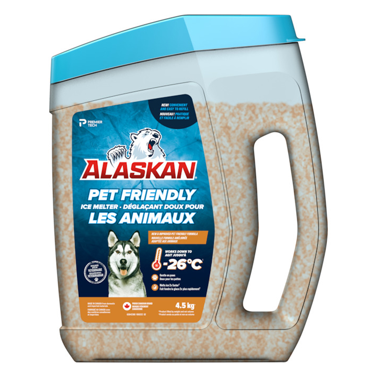 The new Alaskan® Pet Friendly Ice Melter formula was developed in collaboration with a veterinarian. It’s a blend of calcium chloride, sodium chloride and a hydrating agent that is safe for the paws of your furry friends.