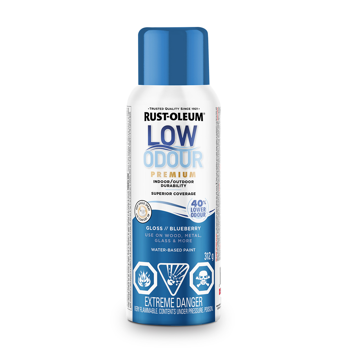 Rust-Oleum® Low Odor Water-Based Spray Paint features 40% less odor than traditional spray paint with the same great performance. It delivers superior coverage and a durable finish on indoor and outdoor surfaces. Low Odor Water-Based Spray Paint can be used on wood; metal; glass; wicker and most plastics.