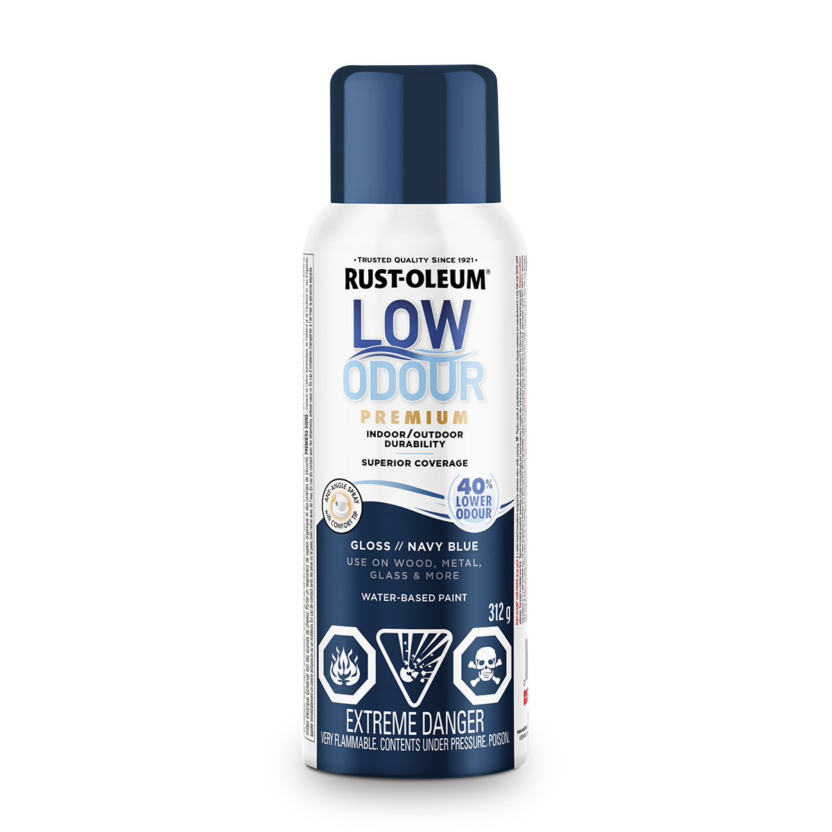 Rust-Oleum® Low Odor Water-Based Spray Paint features 40% less odor than traditional spray paint with the same great performance. It delivers superior coverage and a durable finish on indoor and outdoor surfaces. Low Odor Water-Based Spray Paint can be used on wood; metal; glass; wicker and most plastics.