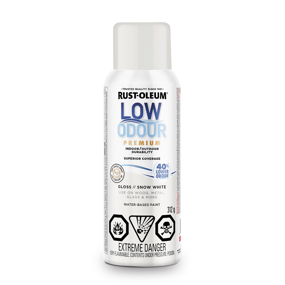 Rust-Oleum® Low Odor Water-Based Spray Paint features 40% less odor than traditional spray paint with the same great performance. It delivers superior coverage and a durable finish on indoor and outdoor surfaces. Low Odor Water-Based Spray Paint can be used on wood; metal; glass; wicker and most plastics.