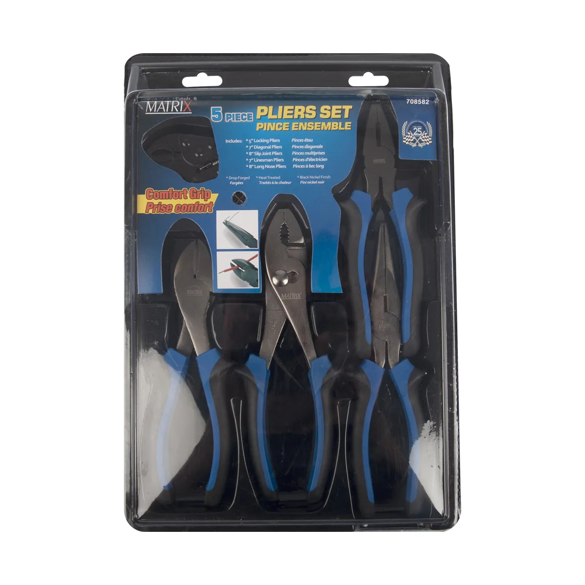 Includes: (1) Locking pliers 5in | (1) Diagonal pliers 7in | (1) Slip joint pliers 8in | (1) Linsman pliers 7in | (1) Long nose pliers 8in.