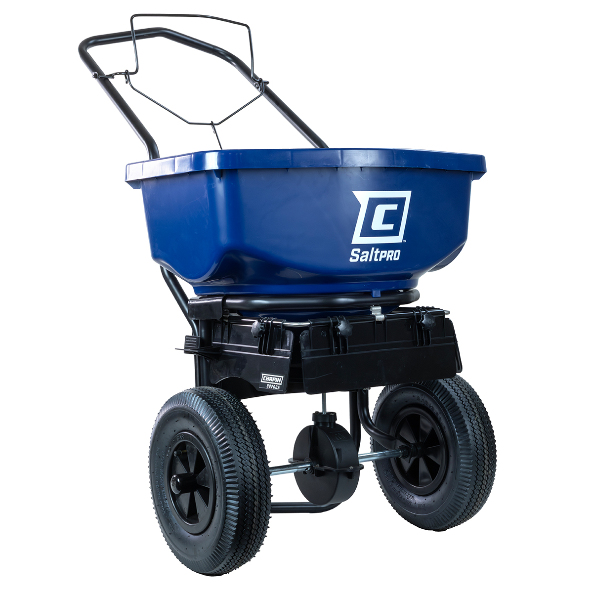 Chapin’s 88200A; 80-pound residential poly salt spreader is made to handle winter conditions. Designed to hold up to 80 pounds of your preferred brand of ice melt or halite. It’s easy to set up with the flip-up; U-shaped handle; adjustable gate dial; and baffles. The spiked auger break ups chunks; minimizing clumps and the 12-inch pneumatic tires give you support over icy and uneven driveways and sidewalks. Weather-resistant; blue poly hopper holds up to 80 pounds of material. Use the baffles to direct where you spread your product and the gate adjustments to properly set the spread amount. Recommended for use with salt; halite; potassium chloride; magnesium chloride and calcium chloride (small and pelletized particulates).